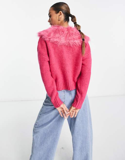 River Island faux fur collar cardigan in bright pink Very well made.